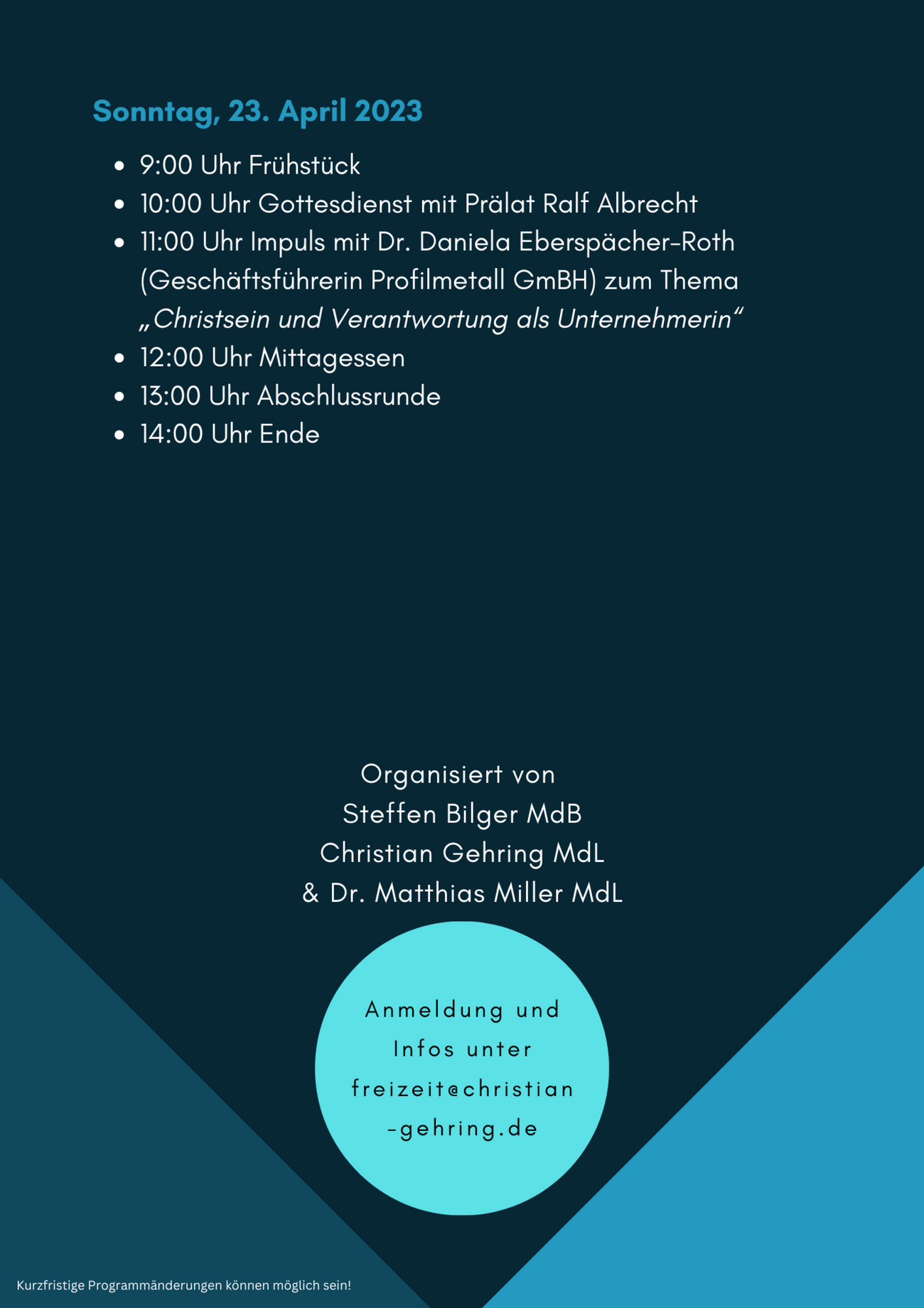 „Wie im letzten Jahr richtet sich unsere Veranstaltung an Menschen, die sowohl an Politik als auch am christlichen Glauben interessiert sind“, benennt Dr. Matthias Miller die Zielgruppe. „Erneut haben wir hierfür ein abwechslungsreiches Programm zusammenstellen können und dürfen uns auf die Teilnahme zahlreicher spannender Gäste freuen.“ So werden in diesem Jahr unter anderem der baden-württembergische Innenminister und stellvertretende Ministerpräsident Thomas Strobl, die Landtagsabgeordnete Sabine Kurtz MdL, die Unternehmerin Dr. Daniela Eberspächer-Roth, der ehemalige bayerische Ministerpräsident Dr. Günther Beckstein, der CDU-Fraktionsvorsitzende im baden-württembergischen Landtag Manuel Hagel MdL, der Antisemitismusbeauftragte der baden-württembergischen Landesregierung Dr. Michael Blume sowie Prälat Ralf Albrecht und Staatssekretär Siegfried Lorek MdL vor Ort sein und die Freizeit begleiten.
