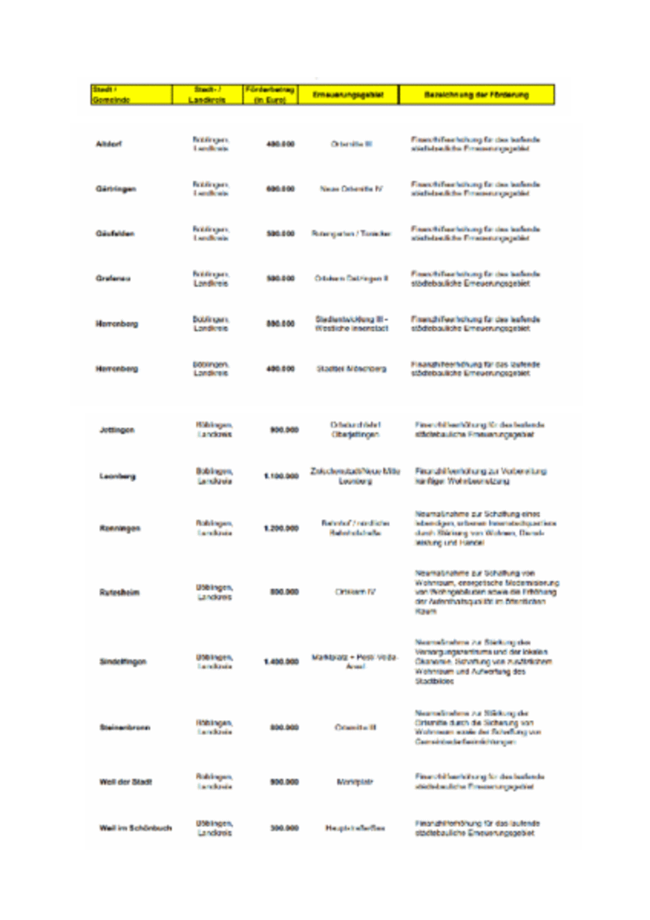 Wie die zuständige Ministerin, Nicole Razavi MdL, den Abgeordneten mitteilte, stellt das Ministerium für Landesentwicklung und Wohnen in diesem Jahr rund 237 Mio. Euro für 313 städtebauliche Erneuerungsmaßnahmen zur Verfügung. Davon kommen rund 76 Millionen Euro vom Bund. „Da das Programm sehr beliebt ist und viel mehr Anträge gestellt wurden als bewilligt werden konnten, ist es umso erfreulicher, dass vierzehn Kommunen im Wahlkreis Böblingen zum Zug gekommen sind und ihre Projekte jetzt anpacken können“, so die Landtagsabgeordneten Sabine Kurtz (CDU - Leonberg), Dr. Matthias Miller (CDU - Böblingen) und Peter Seimer (Grüne - Leonberg). Den Löwenanteil erhalten Leonberg mit 1.100.000 Euro für die Zwischenstadt und Neue Mitte Leonberg, Renningen mit 1.200.000 Euro für den Bereich des Bahnhofs und der Bahnhofstraße sowie Sindelfingen mit 1.400.000 Euro für den Marktplatz und das Post/VoBa Areal. „Die Städtebauförderung feierte 2021 ihr 50. Jubiläum und ist flexibel wie eh und je. Als lernendes Programm reagiert sie immer wieder auf neue, zentrale Herausforderungen, damit die Kommunen fit für die Zukunft werden. Indem sie langfristige Planungen sichert und gleichzeitig notwendige Spielräume ermöglicht, ist die Städtebauförderung eine verlässliche Stütze für städtebauliche Vorhaben in unseren Städten und Gemeinden“, erklären die Abgeordneten Sabine Kurtz (CDU - Leonberg), Dr. Matthias Miller (CDU - Böblingen) und Peter Seimer (Grüne - Leonberg). Weitere Informationen: Insgesamt stellt das Ministerium für Landesentwicklung und Wohnen in diesem Jahr rund 237,19 Millionen Euro für städtebauliche Erneuerungsmaßnahmen zur Verfügung. Davon kommen rund 76 Millionen Euro vom Bund. Gefördert werden insgesamt 313 städtebauliche Erneuerungsmaßnahmen. Darunter sind 51 neue sowie 262 Maßnahmen, für die weitere Mittel freigegeben werden. Schwerpunkte der Städtebauförderung sind Innenstadt- und Ortskernprogramme, Wohnraumschaffung und Maßnahmen zum Schutz des Klimas. Um die Folgen der Pandemie zu bewältigen, werden die Städte und Gemeinden verstärkt dabei unterstützt, ihre Innenstädte lebendig zu halten. Beim Klimaschutz geht es vor allem um die energetische Sanierung von Altbauten, die Reduzierung von Lärm und Abgasen oder die Unterstützung des Holzbaus. Eine der Kernaufgaben der Städtebauförderung ist es, bezahlbaren Wohnraum für alle Alters- und Bevölkerungsgruppen zu schaffen und den Bewohnerinnen und Bewohnern ein attraktives Lebens- und Wohnumfeld zu erhalten. Mit den Fördermitteln werden Wohnungen u. a. modernisiert, um sie energetisch auf den aktuellen Stand zu bringen und Barrierefreiheit zu ermöglichen. Gleichzeitig wird darauf geachtet, historische Bausubstanz zu erhalten. Nach neustem Stand sollen in den neu aufgenommenen Sanierungsgebieten in den nächsten Jahren insgesamt rund 2.500 neue Wohnungen entstehen, rund 2.400 sollen modernisiert werden. In den Sanierungsgebieten, für die weitere Mittel freigegeben wurden, können rund 10.900 neue Wohnungen entstehen und rund 8.000 modernisiert werden. Besondere Planungssicherheit für die Kommunen bietet die Städtebauförderung durch die Bewilligung von Finanzhilfen über Zeiträume von in der Regel acht bis zwölf Jahren. Die Städtebauförderung wirkt auch als Wirtschaftsmotor, da jeder eingesetzte Fördereuro durchschnittlich acht Euro an öffentlichen und privaten Folgeinvestitionen auslöst. Davon profitieren das regionale Baugewerbe und das Handwerk. Die einzelnen Fördermaßnahmen für den Landkreis Böblingen entnehmen Sie bitte der Anlage.